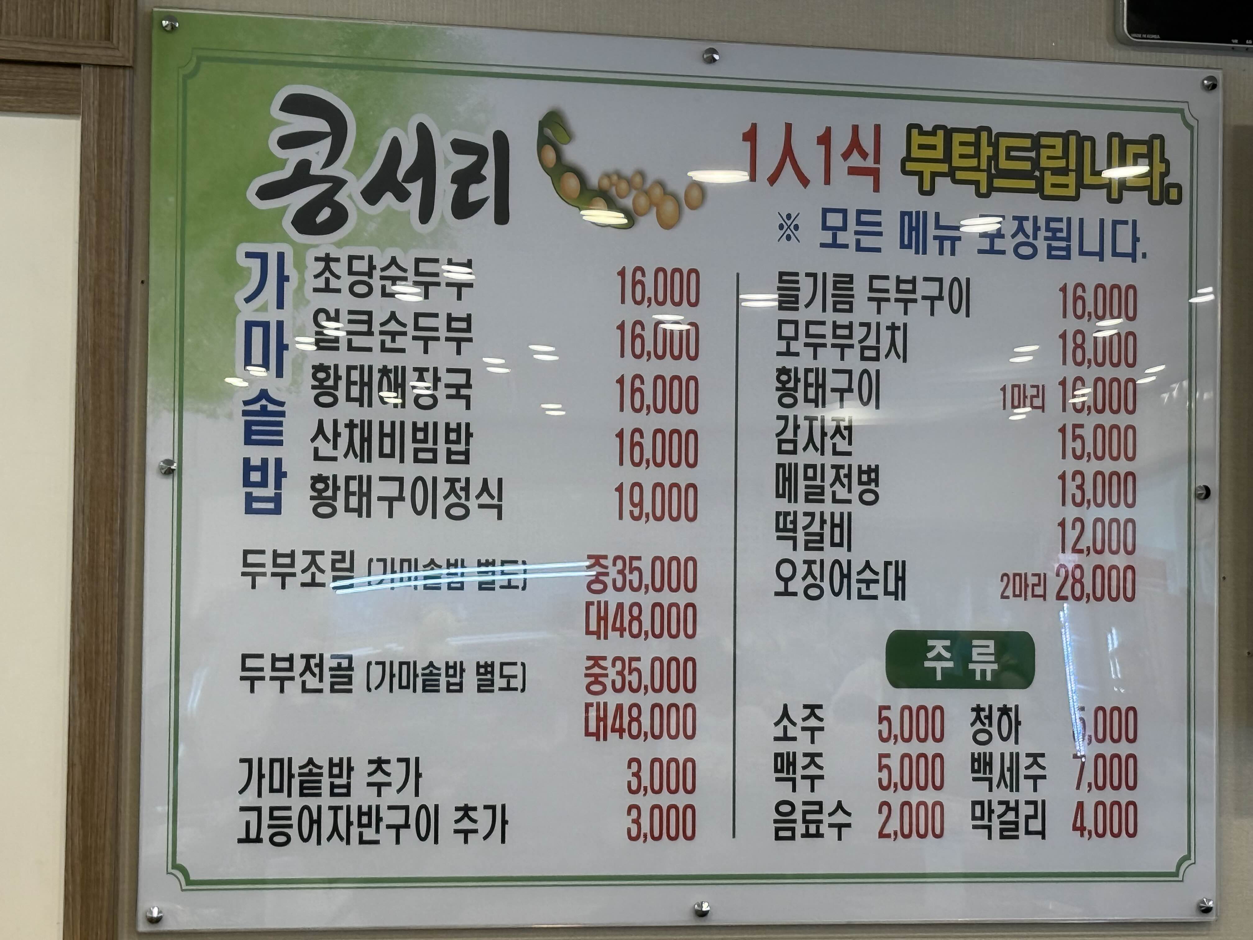 가격은 일반 순두부집보다 살짝 높은 편이었지만, 솥밥과 푸짐한 반찬, 그리고 신선한 재료를 생각하면 충분히 납득되는 수준이었어요.